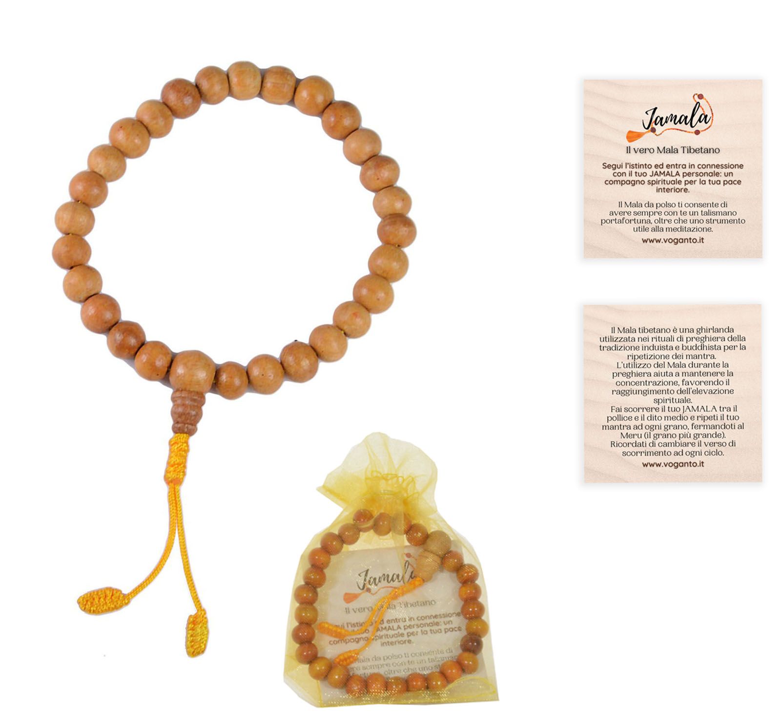 Ogni JAMALA è contenuto all’interno di un raffinato sacchetto d’organza e accompagnato da un tagliandino che riassume informazioni sui mala e sul loro utilizzo.