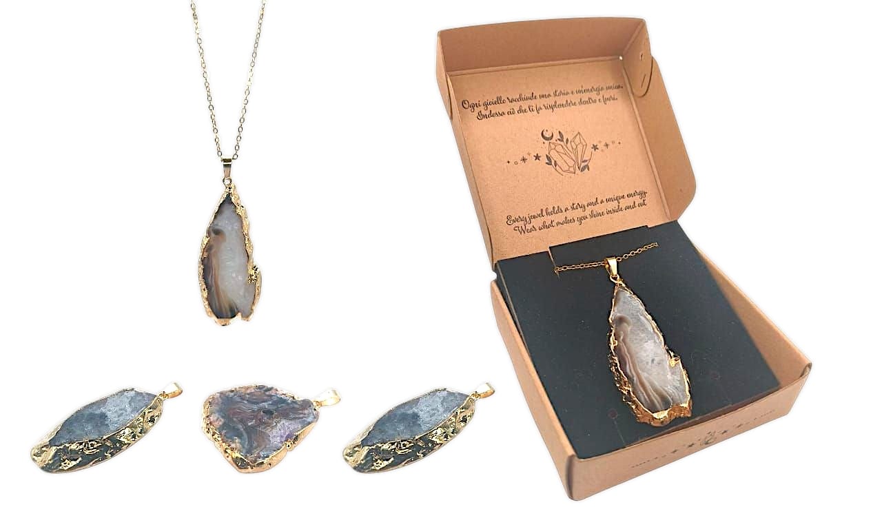 Il Ciondolo agata grezza naturale cm 5 è un gioiello unico realizzato con fette di agata naturale non trattata, rifinite con elegante bordatura dorata. Ogni pezzo è diverso, con venature e trasparenze tipiche della pietra, simbolo di equilibrio e protezione. Completo di catenina in acciaio e confezione in scatola kraft con messaggio motivazionale, è perfetto per la rivendita in negozi esoterici, olistici e spirituali. Un prodotto artigianale ed energetico che valorizza la bellezza delle pietre naturali. Siamo grossisti e importatori diretti, specializzati nella vendita all’ingrosso B2B di minerali e accessori in pietra.