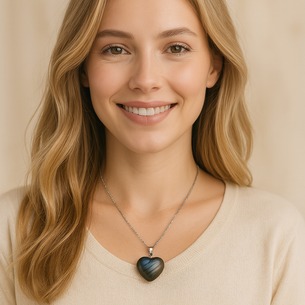 Ciondolo in labradorite naturale a forma di cuore, misura 3 cm, con catenina in acciaio e scatola regalo. Ogni pezzo presenta riflessi unici che variano con la luce. Perfetto per negozi spirituali ed esoterici. Siamo importatori diretti specializzati nella vendita all’ingrosso B2B di ciondoli in pietra naturale.