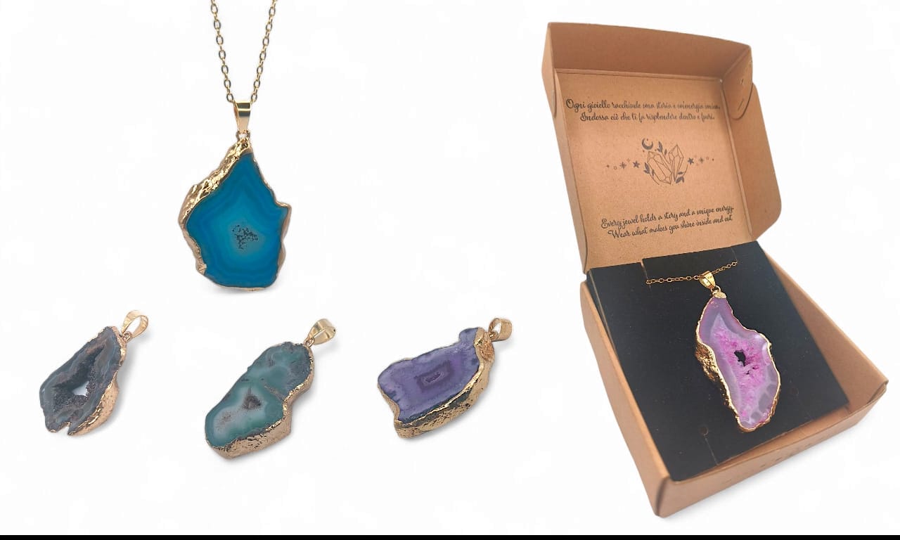 Collana con ciondolo in agata colorata naturale, taglio fetta, con bordo dorato galvanizzato, altezza di circa 5 cm. Ogni pezzo è unico grazie alla naturalezza della pietra e delle sue venature. La collana è accompagnata da scatola confezione ed è subito pronta per l’esposizione o la vendita. L’agata è una pietra simbolo di equilibrio, armonia e protezione. Questa collana è ideale per il canale B2B: offriamo vendita all’ingrosso a rivenditori e negozianti, come grossisti e importatori diretti di bigiotteria in pietre naturali.